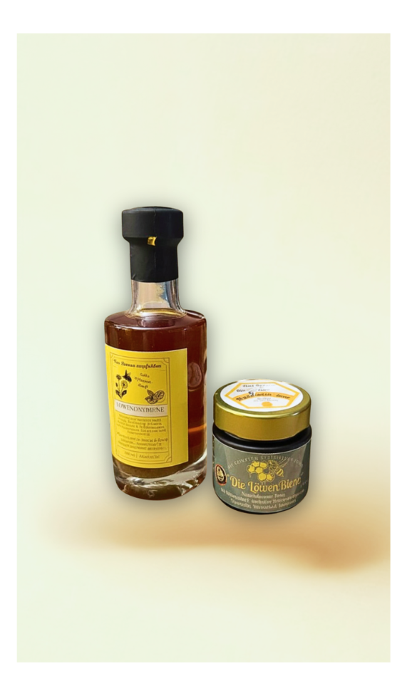 die Löwen-OxyBiene, ein traditionelles Oxymel nach über 100-jährigem Rezept, und die LöwenBiene, unseren fein gerührten Honig mit ausgewählten Kräuterauszügen.