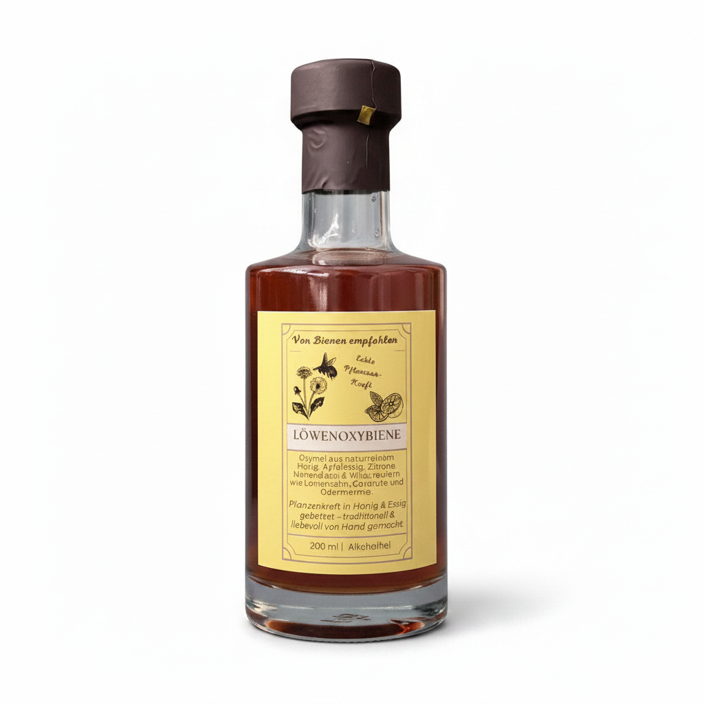 In der Löwen-OxyBiene verbinden sich naturreiner Honig, Apfelessig, Zitrone sowie ausgewählte Wildkräuter wie Löwenzahn, Mariendistel und Odermennig zu einer harmonischen Komposition – traditionell hergestellt und in kleinen Chargen von Hand gerührt.