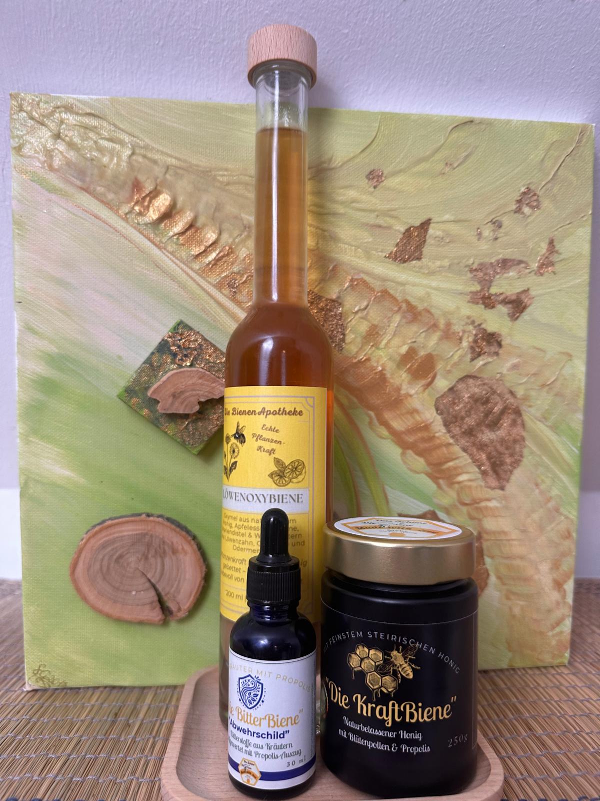 bestehend aus: „Die LöwenOxyBiene 200ml“, „Die KraftBiene 250g“ & „Die BitterBiene 30 ml“